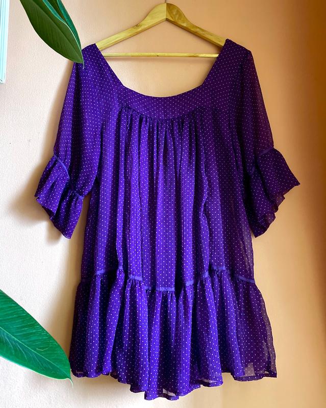 Женское платье волан в мелкий горошек . - верх выполнен из легкого шифона - внутри есть подкладка - не просвечивается - вырез лодочка 🌱цвет: фиолетовый 💜 🌱размер: 14 UK | M/L/XL-one size Замеры уточняйте 🌱состав: 80% полиэстер | 20% хлопок