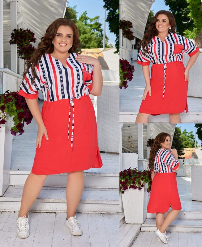 предоплата 100% Платье елиs Модель : 3192 - Размеры: 50,52,54,56-58 - Длина изделия по спинке: 106 см (миди) - Длина изделия по переду: 102 см - Рукав: 30 см (короткий) - Материал: турецкий коттон лето - Цвета: полоска с красным, полоска с синим, зигзаг с синим - Детали: кулиса для фиксации пояса, накладной карман проклеен элементами из страз - Цена : 480грн Воздушное платье из софта свободного кроя. Пояс регулируется шнурком, на кармашке апликация из страз, очень удобное и практичное в повседневной носке