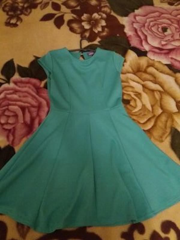 Сукня з коротким рукавом, укр.розмір 42-44, у відмінному стані, без дефектів. Колір бірюзовий. Довжина 84 см, ширина плечей 35 см, ПОГ 47 см, ПОТ 34 див. Тканина добре тягнеться.