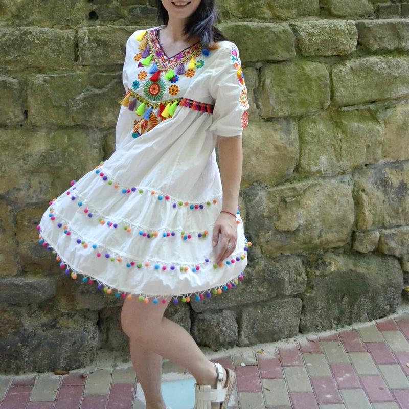Оригинальное платье в этно стиле. Материал хлопок. Машинная вышивка+ висюльки+ помпоны. Мои параметры : рост 268 см, 86-68-93 см Замеры платья: длина 88см , обхват груди 92 см, плечи 38 см Рукав застёгивается на маленькую перламутровую пуговку. Длина на мой рост до колена. Материал тонкий, не жаркий