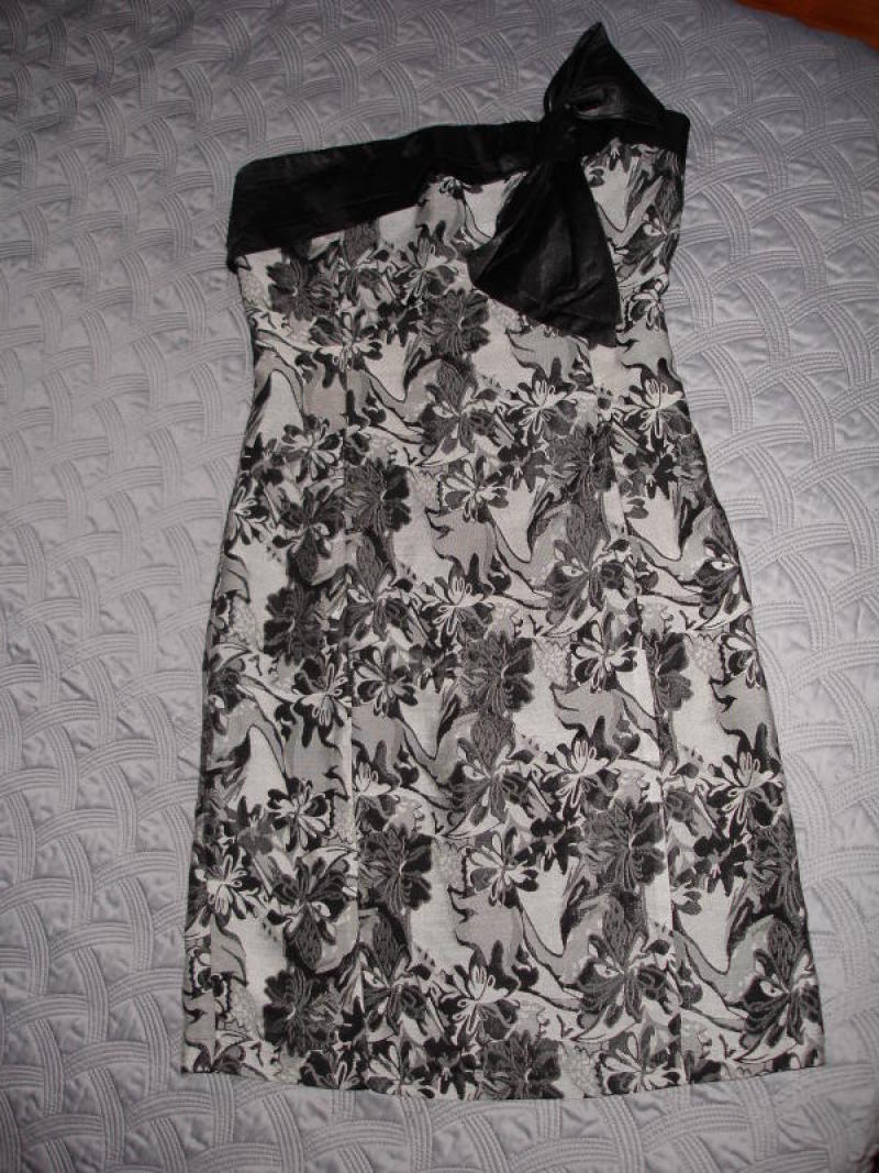 Сукня-бюстьє сріблисто-чорне з оздобленням у вигляді банта з чорного атласу, ззаду блискавка. Тканина на вигляд виглядає об'ємною - за типом жакарда. Незважаючи на те, що розмір на етикетці - 12, плаття ушивалось і йде на М (10)