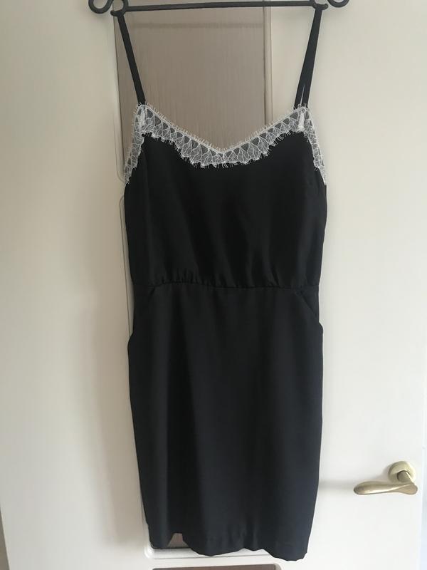 Маленька чорна сукня від бренду BCBGeneration, розмір 6 амер. (36-38), наш 44-46 (С-ка). Бретелі регулюються, зверху нашито мереживо білого кольору, відрізна по талії, збоку на блискавці і двох кнопках. Купувала для себе, але, нажаль, замале.