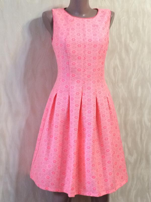 Жакардове приталену сукню F&F р. 8, нове (без етикетки). Сукні з тканини, яка добре тримає форму, спідниця із зустрічними складками, по спинці потайна застібка блискавка і гудзик, є легка підкладка. Склад тканини 69% бавовна, 19% поліестер,12% нейлон. Колір суміш рожевого і коралового. ПОГ45см, ПІТ 37-38см, довжина 92см. Висилаю Новою поштою, укрпоштою _4705