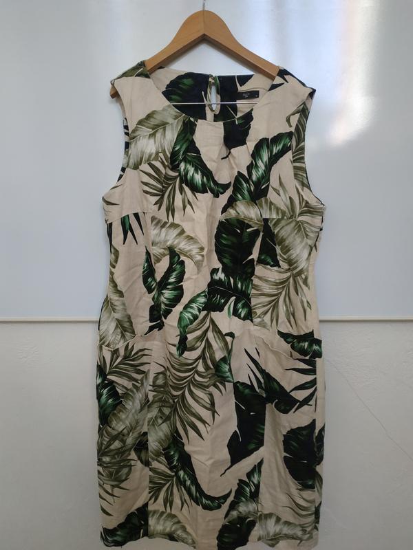 Летнее платье футляр на невысокую девушку от Max&Co. Размер 16. Лен с вискозой. Есть карманы. Очень красивый принт пальмовые листья. Длина 90 см, ширина под руками 51 см, талия 45, бедра 53 см