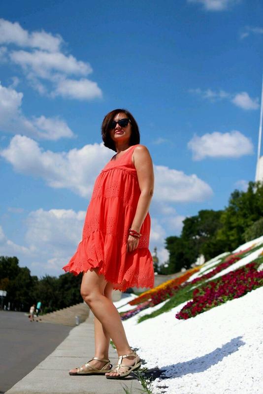 Платье, три оборки, ткань с перфорацией, на подкладке из батиста красивый коралловый цвет
