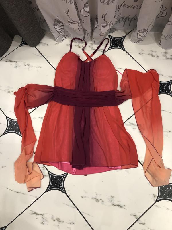 Незвичайне плаття з градієнтом. Спинка йде відкрита зі шлейками навхрест, шлейки регулюються. Великий довгий пояс пришитий до сукні, його можна зав'язати як спереду так і ззаду. Сукня без дефектів. Розмір 10. На грудях йде пушап.