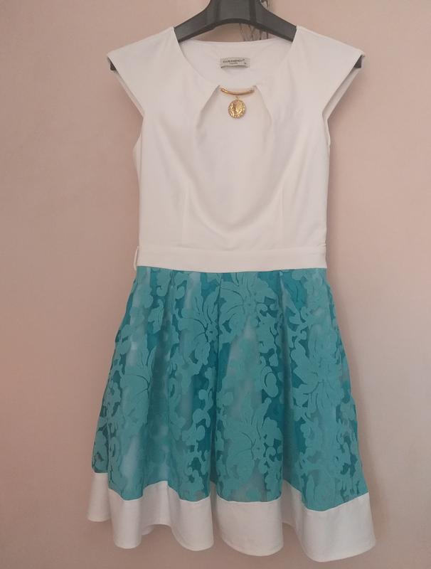 Гарне плаття з бірюзового кольору спідницею, тканина спідниці прозора з вибитим візерунком, є підкладка) Верхня частина сукні з цупкої тканини на шиї імітація намиста. ПОГ 42 див. ПІТ 34 див., спідниця вільного крою. Довжина 86 див.