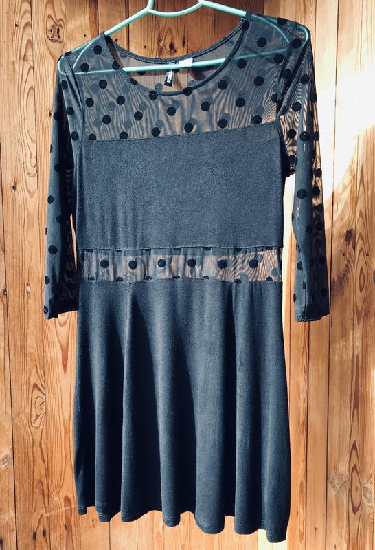 Дуже красиве миле чорне плаття! Незамінна річ у гардеробі. Сукня гарно лягає по фігурі, доповнено Елегантною якісної сіточкою в горошок. Розмір на етикетці М. Тканина тягнеться. Заміри: пог 46 див., піт 40 см, довжина 84 див., в стегнах вільний. Є багато цікавого дивіться інші мої оголошення! Підписуйтесь щоб бути в курсі новинок!