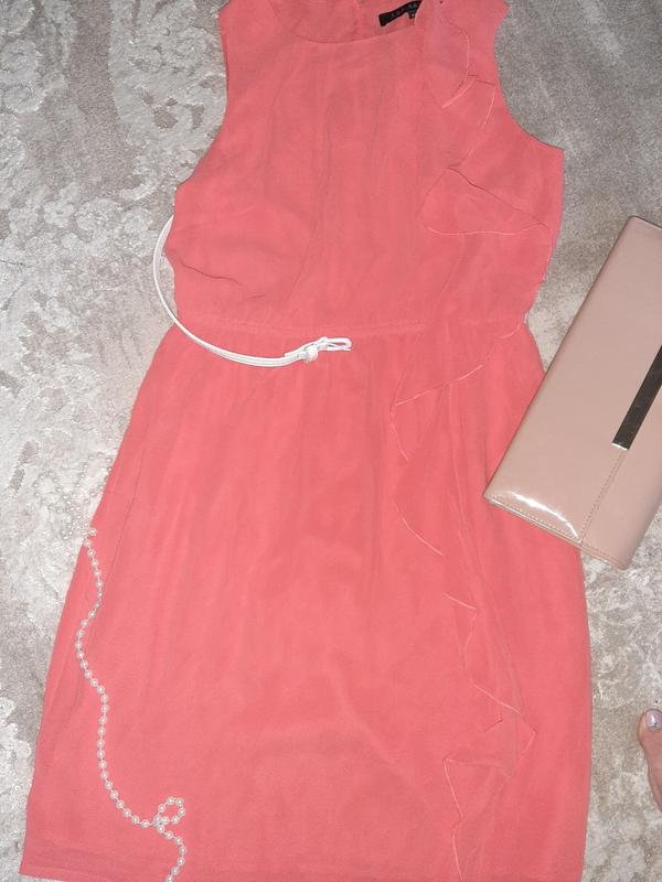 Чудове літнє плаття з воланом, коралового кольору. Тканина шифон. З підкладом., не просвічує. Пояс до комплекту не йде. Розмір S/36. Додаткові фото та заміри за потребою.