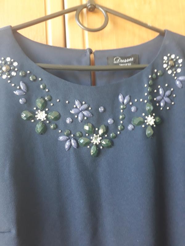 темно-синього кольору,з красивим оздобленням на грудях,одягнена один раз.Має затяжку низом спереду--фото7.Сукня має повністю підкладку-фото6.Колір--як на фото 1,4 Заміри:довжина по спинці 86см,плечі 40см,між пахвами 50-52см,ПОТ 48-50см,в сідницях 110см Віскоза, полієстр, еластан