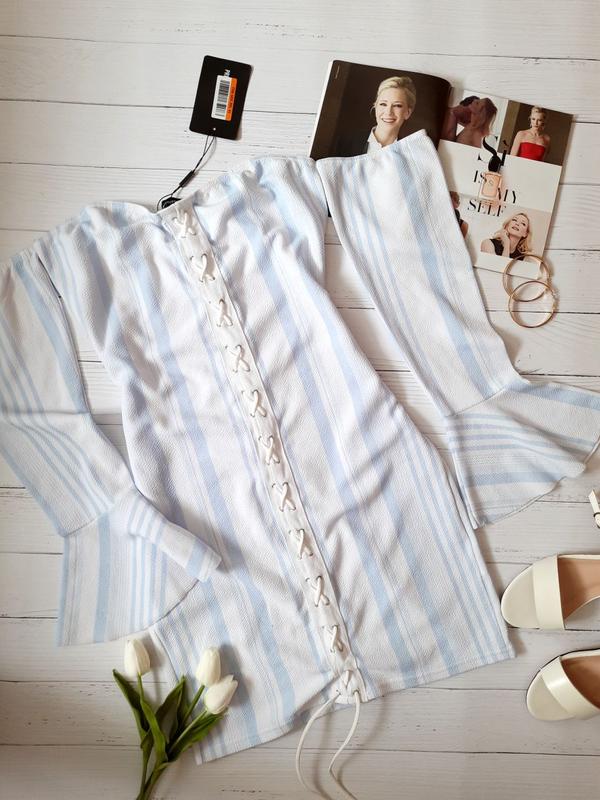 Нежное и романтичное платье с открытыми плечиками и длинным оригинальным рукавом. Размер указан 18. Полуобхват груди - 43 см. Полуобхват талии - 41 см. Полуобхват бедер - 45 см.