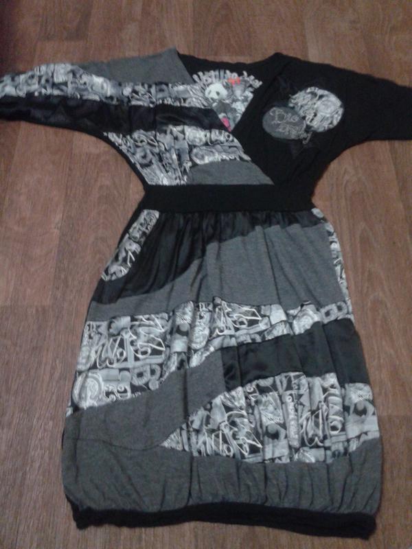 Оригинальное трикотажное платье чёоно-серого цвета, с атласными вставочками, рукам 3/4, внизу на манжете, размер указан М, но скорее на S.