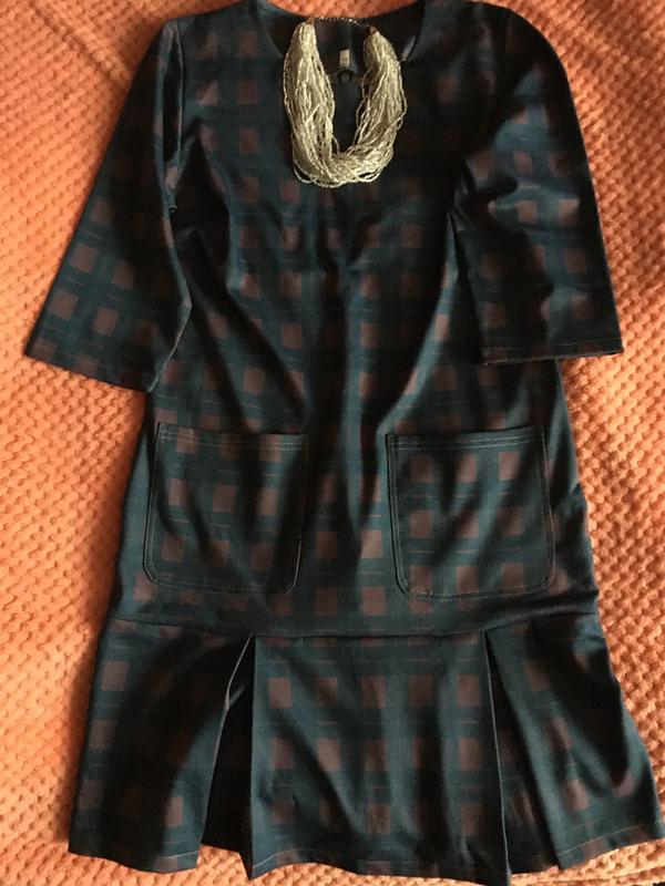 Плаття в рожеву клітинку з трьох четвертьовим рукавом, накладними карманами, широка шлярка, застібка на спині} Довжина - 85 см, талія - 86 см, 38 розмір