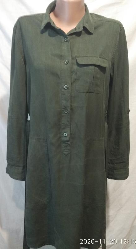 Классное модное платье рубашка,в отличном состоянии.Цвет темнозеленый бутылочный,камера искажает цвет..Размер указан 8.Замеры:пог-50,пот-50,поб-50,плечи-41. Длина рукава-57,длина по спинке от ворота-95.Пуговицы до середины платья,рукава подстегиваются,имеются накладные карманы по бокам.Можно носить с поясом и без пояса.Ткань:100%вискоза.