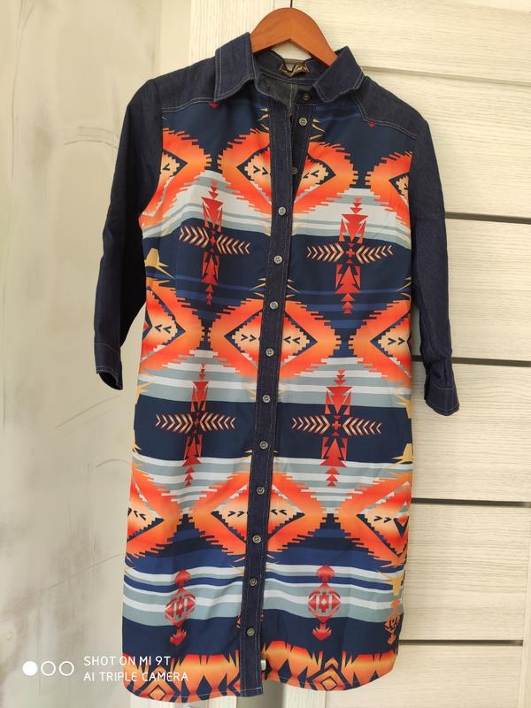 спереду яскрава тканина, без кишень, короткий, низ заокруглений.Довжина по спинці 84, ПОГ 48, рукав-43, плечі 40. стан ідеальний
