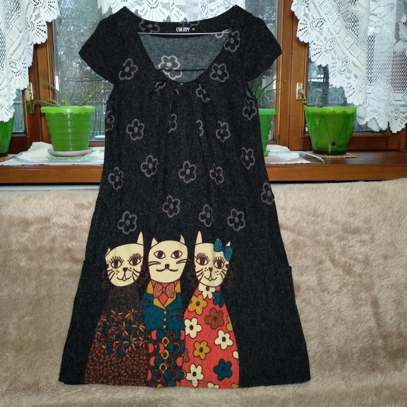 Теплое платье с принтом "коты". Новый, но без бирки. Декорирована пуговицами, рукавчики полуоткрытые, удобные кармашки. Замеры: длина от плеча 87 см., полуобхват груди 43 см., полуобхват талии 43 см., длина рукава 12 см.