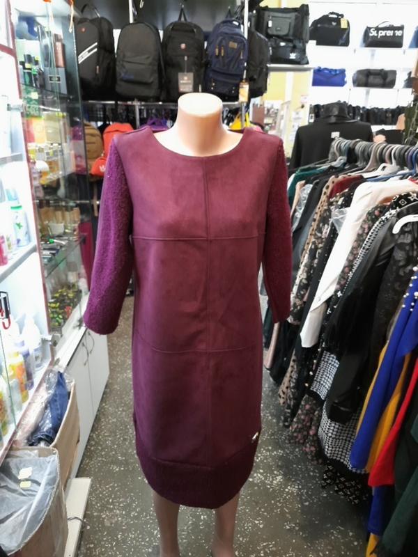 Рукави і низ сукні - букле. Виглядає стильно, тепле, може бути як офісний варіант{ красиво виглядає}. Заміри: рукав-46, пог-54, пот-50, побіди-55, довжина 95