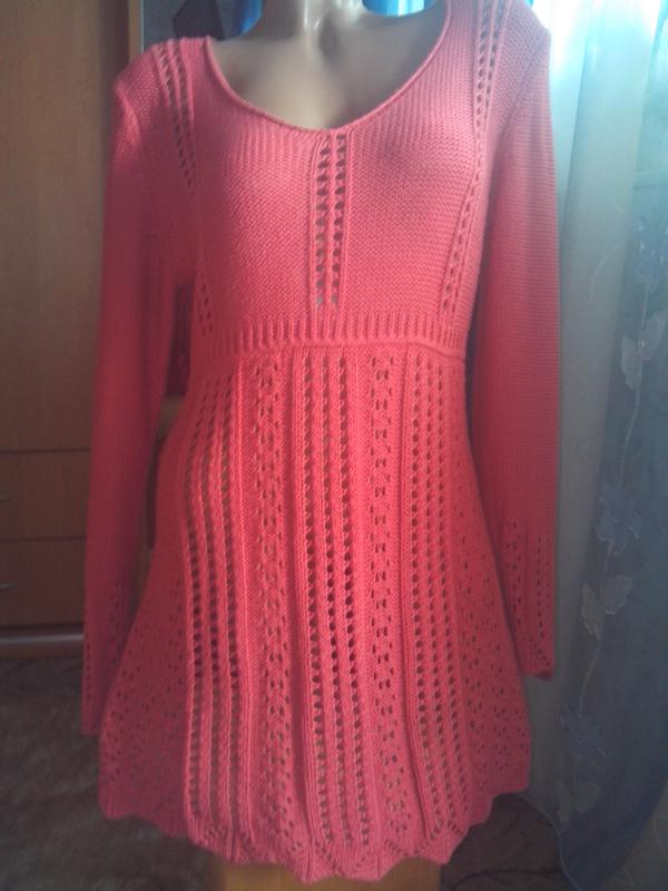 Тёплое, вязанное, ажурное платье-туника кораллового цвета с длинными рукавами и не глубоким декольте. Размер указан 40\42, наш 46-48 и даже не большой 50, замеры: длина 87 см, плечи 44 см, ПОГ 48 см, ПОТ 38 см, ПОБ 45 см, рукав сверху 67 см, снизу 50 см. Ткань, состав: 50% коттон, 50% акрил, отлично тянется. Б/у, НО, в отличном состоянии;-)... Доставка УП ( + 20 грн. ) или НП;-)...
