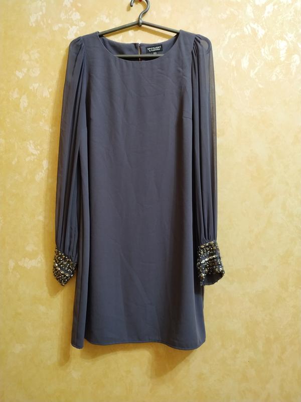 Гарне плаття з шифоновими рукавами, прикрашеними на манжетах намистинами. Сукня вільного крою, красивого графітового кольору