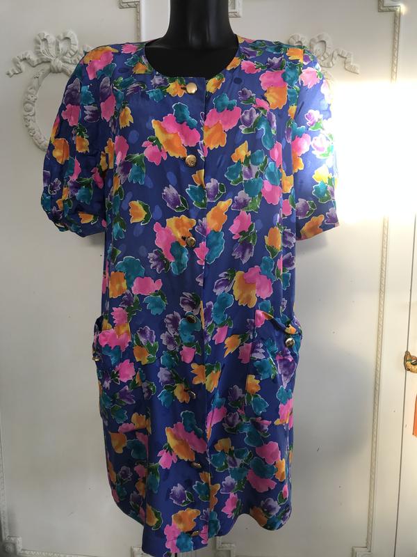 Красиве яскраве виріб ручної роботи. Шовк найвищої якості, переливається. Красиві золоті гудзики красиво поєднуються із забарвленням , це або короткий халатик, або туніка(добре підійде під широкі легкі брюки). Заміри:довжина-90 см, ПОГ-56 см, ПОБІДИ-60 див.