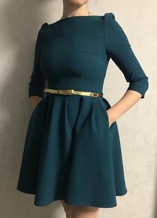 Сукня красивого пляшкового кольору у відмінному стані. Відмінно сідає по фігурі, приховуючи всі недоліки і підкреслюючи фігуру. Ззаду замочок. Рукав 3/4. 38 розмір, підійде на S-M. Довжина - 84 см ВІД - 68 см Довжина рукава - 44 див. В комплекті йде золотистий ремінець бантиком.