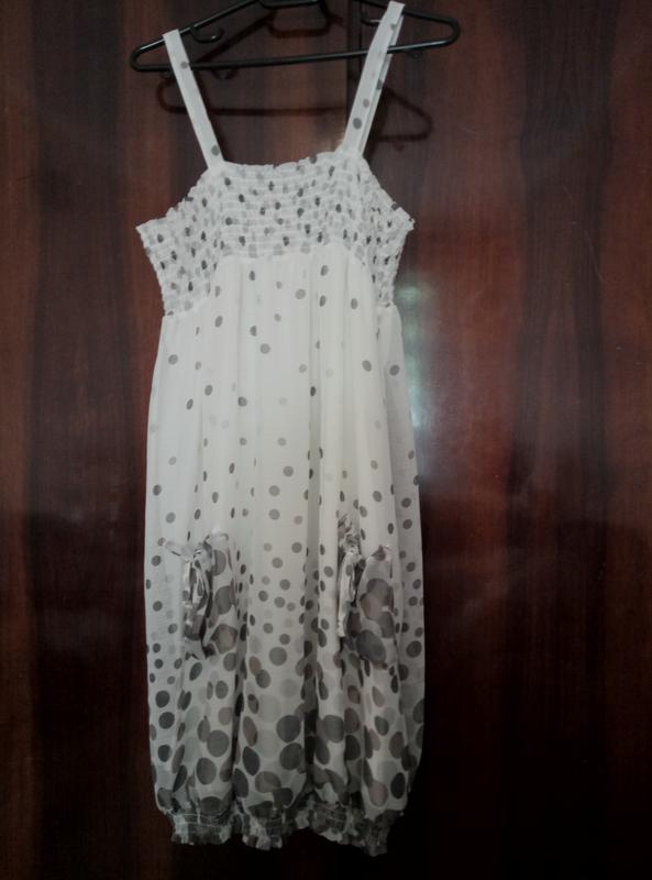 Шифоновый сарафан белого цвета, трикотажной подкладке, низ на резинке, тоненькие бретели, корсет также на резинке, по бокам два накладных кармана, украшенных бантиком. Доставки из точки выдачи ROZETKA осуществляются один раз в неделю по СУБОТАХ!!! Отправка посылок УКРПОПТОЮ или НОВОЙ ПОШТОЮ происходит ежедневно помимо НЕДИЛИ!!!