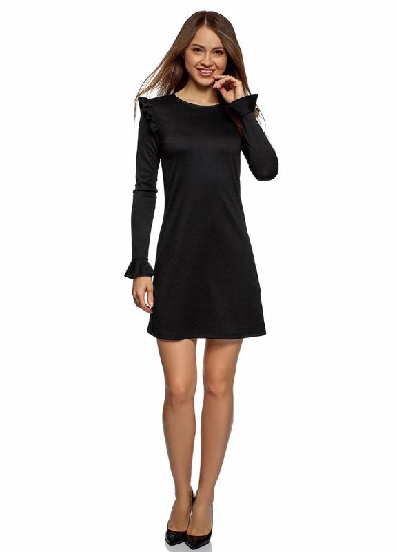 Ефектне плаття А-силуету з довгими рукавами і невеликим округлимо вирізом. Рукава оформлені расклешенними манжетами, а пройма - воланами. Склад: 77% поліестер, 19% віскоза, 4% спандекс.