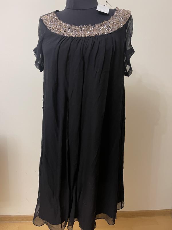 Сукня, шовк 100 %, напівпрозорий верх на тонкій підкладці, прикрашене по горловині камінням. Розмір 6. ПОГ 52 см, ПОБІДИ 67 см, довжина 90 див. Бренд BcbgMaxazria.