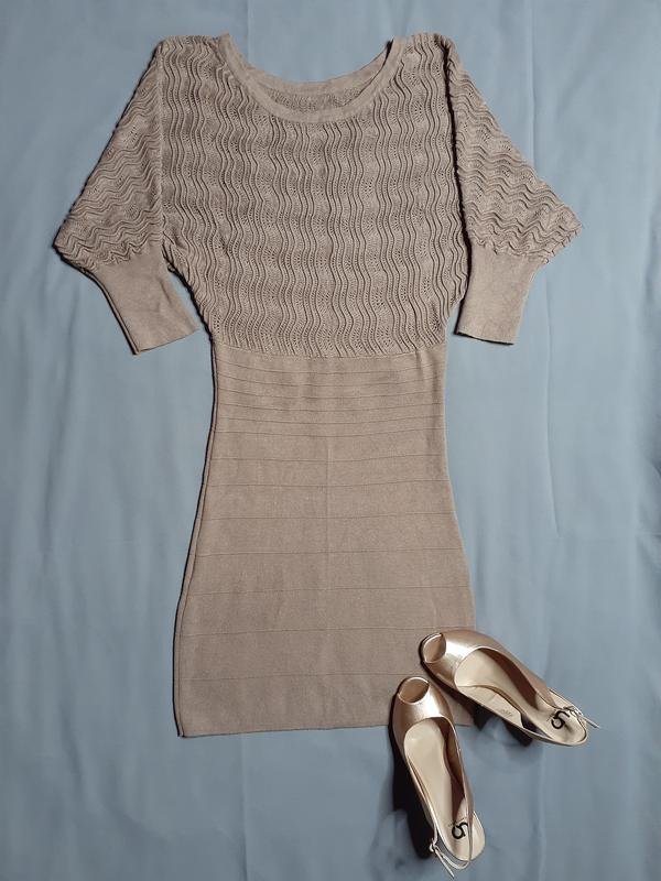 гарне плаття благородного нюдового кольору, машинна в'язка, довжина 91, довжина рукава від горловини 48, об'єм грудей вільний, піт 32, побіди 38
