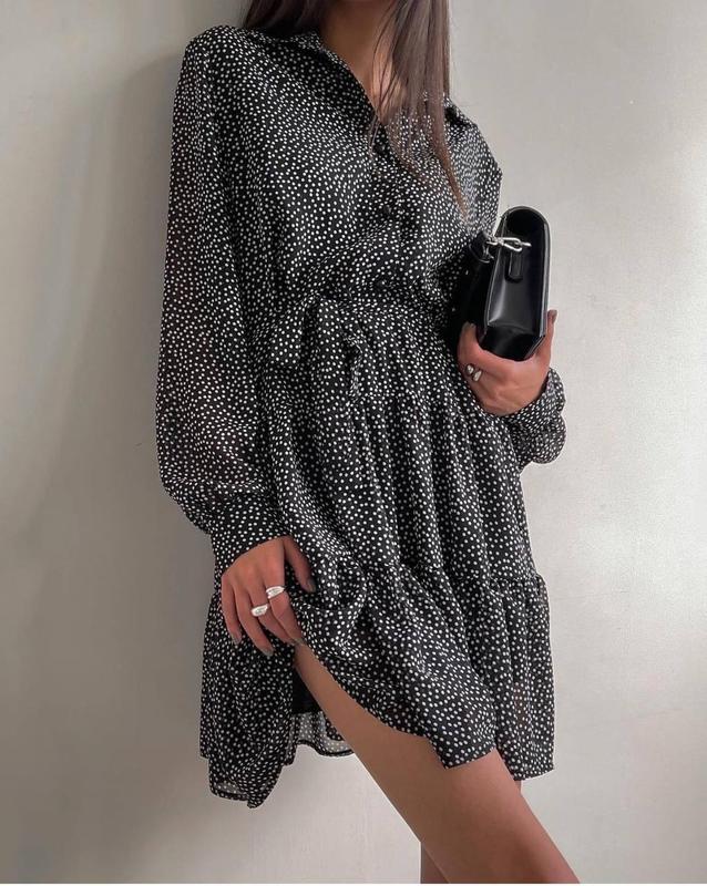 Платье Мод 168АЛ Ткань - софт Размеры - 42-44 и 44-46 Цвета - черный в белый горох Супер качество, верх на пуговичках, рукава на манжете, снизу волан, очень стильно и модно смотриться