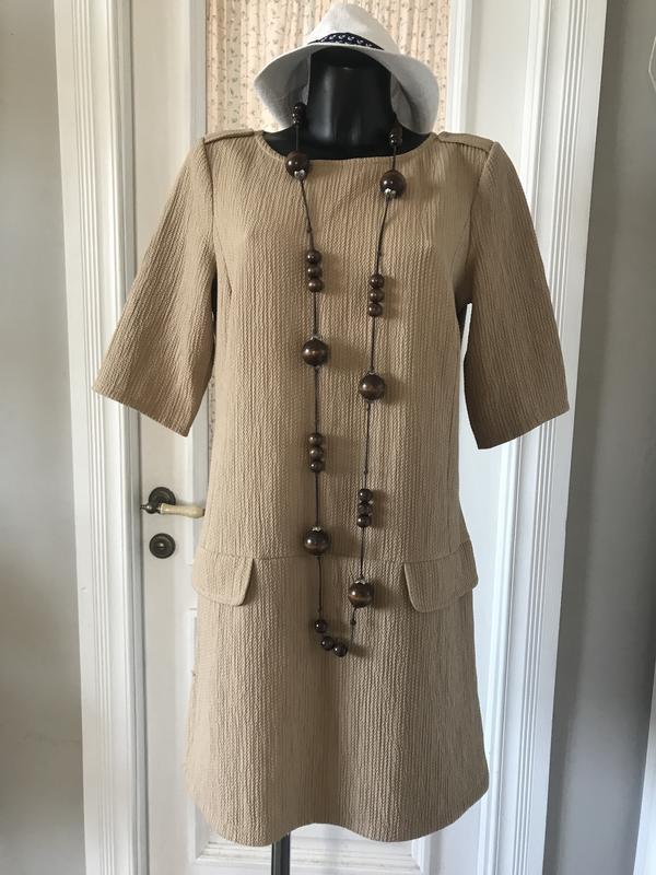 Стильне плаття А-силуету. Колір-бежевий. Рукав до ліктя. Без підкладки. Тканина щільна, добре тримає форму. Застібка-блискавка в бічному шві. Відмінний стан. Заміри:довжина-90 см, ПОГ-50 см, ПОБІДИ-51 див.