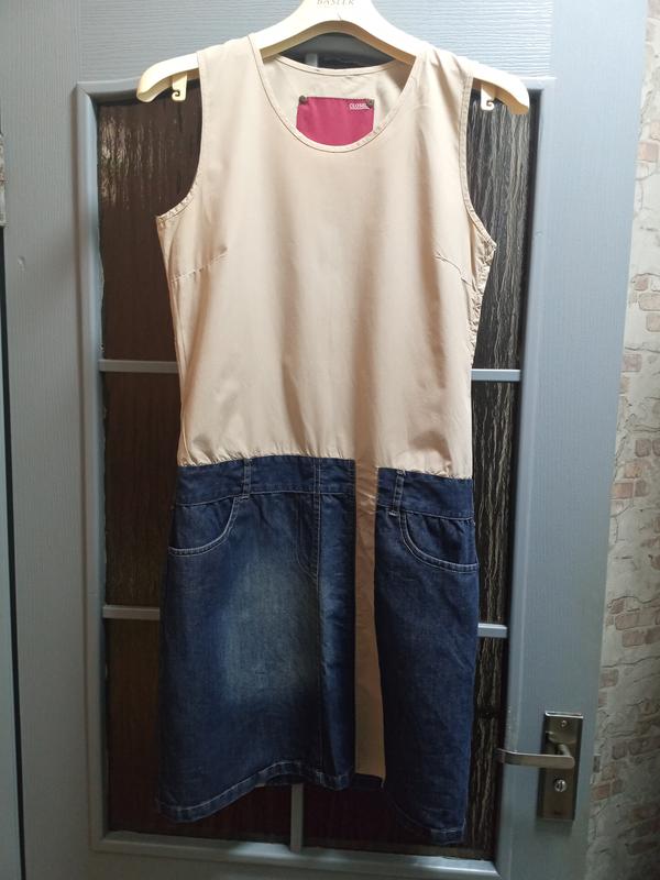 Цікаве сукня комбіноване. Верх - щільна сорочкова тканина, темний беж, низ - джинс. Розмір S, M В ідеальному стані, без дефектів