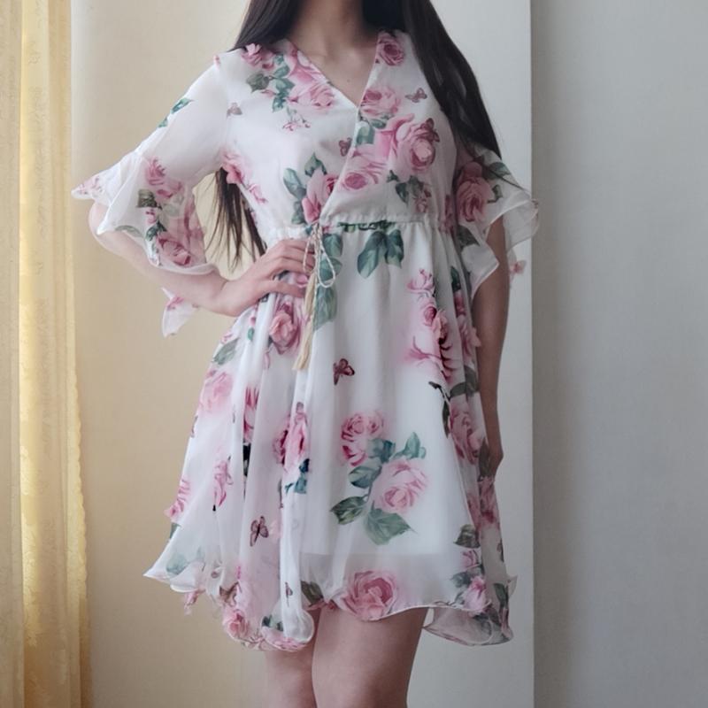 Ошатне літнє плаття в квітковий принт. Дуже красиве легке плаття з підкладкою, поділ сукні й рукави воланами, спідниця сонце, талія затягується на гарний джгутик з пензликами. По всьому сукні на квітах пришиті маленькі бутончики з шифону.