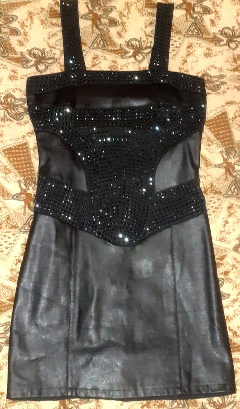 Нове, ефектне, сексуальне плаття, гарно підкреслює фігуру . Тканина якісна еко шкіра на підкладці. По спинці довга блискавка. Довжина сукні 82 див.