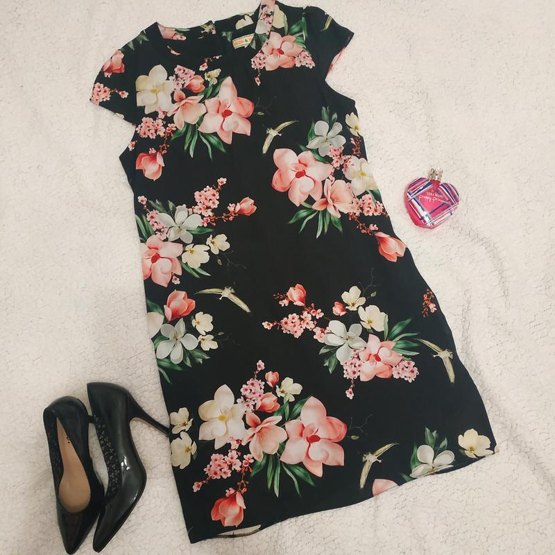 Сукня прямого крою, з квітковим принтом. На підкладці, не просвічує. Склад верх 100% віскоза, підкладка 100% поліестер. Розмір М. Довжина 91 см ПОГ 49 см