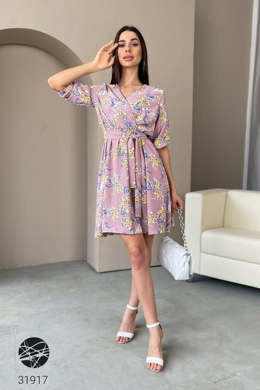 Платье с дизайном на запах и цветочным принтом. V-образный вырез, рукава три четверти с фиксирующей резинкой, на талии резинка. В комплекте пояс из основной ткани.