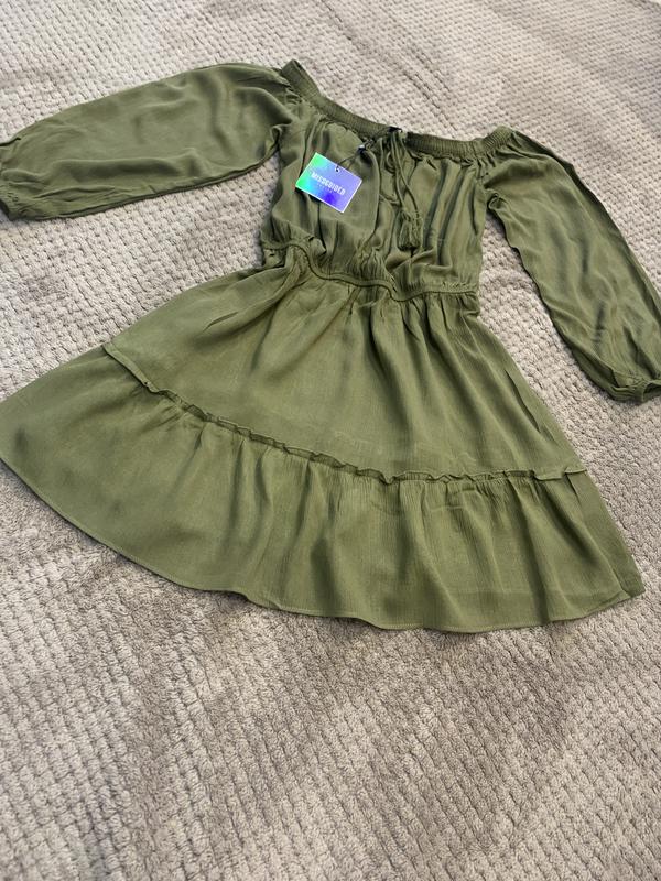 Красивое платье цвета хаки с рукавами и открытыми плечами Резинка на плечах и на талии Идёт на размер S-M