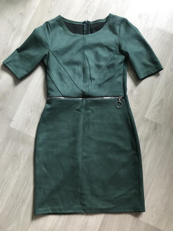 Замшова сукня, спереду в поперек замок , з короткими рукавами. Спина на молнії.