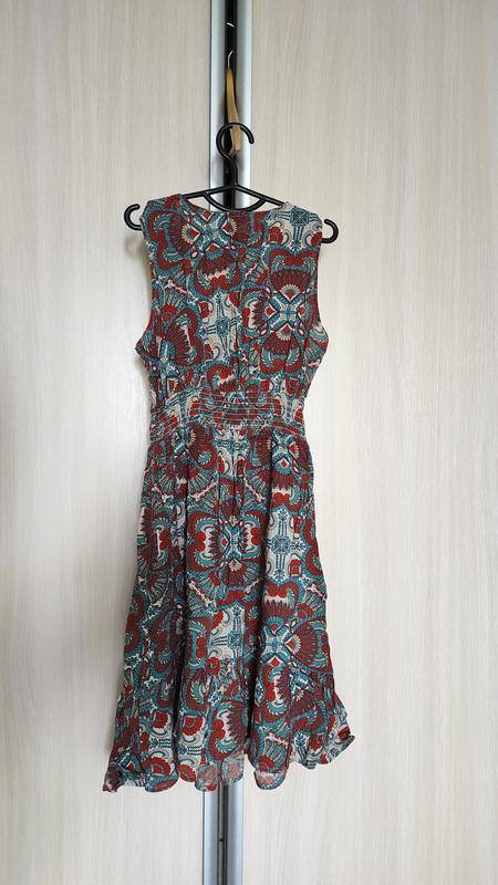 Лёгкое летнее платье, размер S, под грудью хорошо прилегает резинка, вырез спереди можно регулировать булавочной, так что подойдёт на любой размер груди. Без дефектов. По интересующим вопросам обращайтесь, отвечу с радостью 🤗