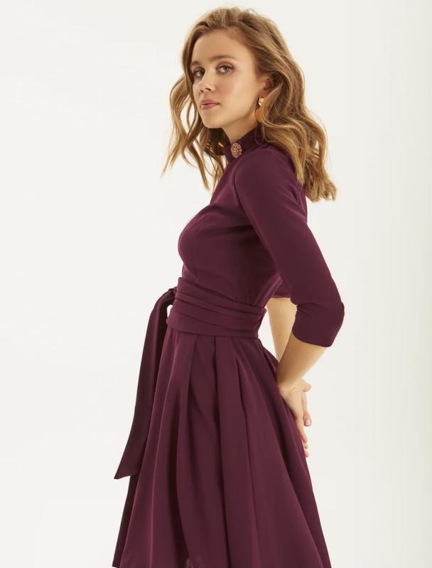 Одягала 2 рази, ідеальний стан.Елегантне плаття А-силуету з еластичної тканини: короткий комір-стійка зі знімною брошкою, облягаючий рукав 3/4, розкльошена спідниця з м'якими складками, доповнена знімним поясом в тон. Колір: марсалаМатериал: креп-дайвінг Склад: поліестер 70% віскоза 27% лайкра 3%