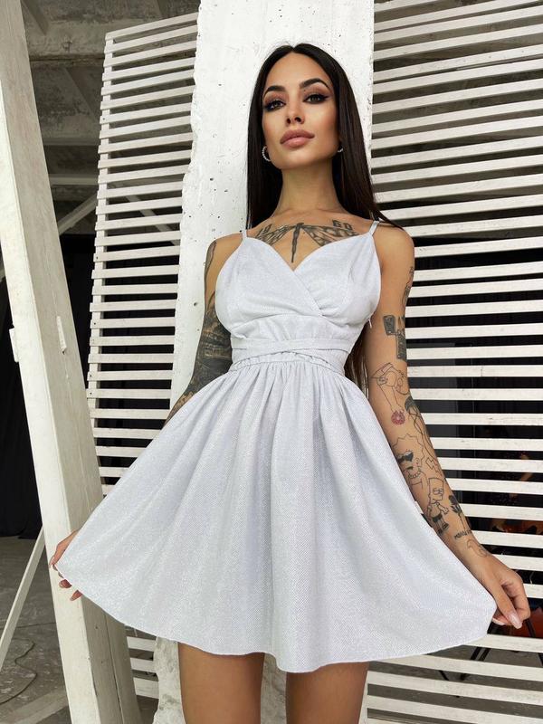 Блискуче плаття з пишною спідничкою і зав'язками на талії💣 ▫️тканина: люрекс ▫️розмір: S і М 🛒ВІДПРАВКА замовлення 1-5 раб. дня! ⠀