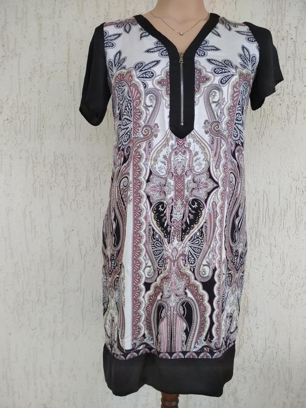 Лёгкое платьице свободного кроя с оригинальным рисунком,100%вискоза, состояние отличное. Длина 85, п/о 45.