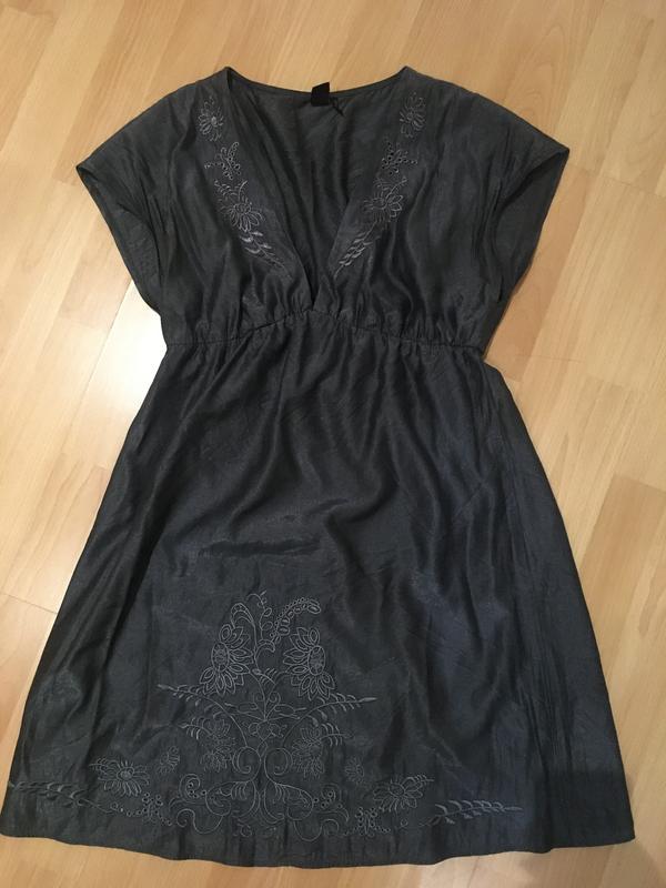 Невесомое, тоненькое. Не просвечивается. Цвет графит, на солнце смотрится просто феерично! очень функциональное летнее платьице. Размер С, длина 88 от плеча. Талия на резинке, завышена. Красивое декольте . Выбита вышивка - главное украшение изделия. Сток. Состояние нового