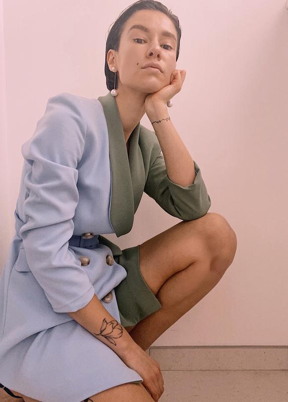 Половина блакитна, половина евкаліптова. На мій ріст 175 см сидить як піджак, для сукні коротковато, український бренд nuvola, на підкладці