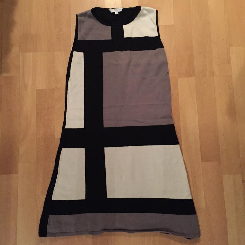 Дуже крууутое коротеньку сукню ,впевнена такого більше не буде ні в кого!машинна в'язка,незвичайні геометричні візерунки,ззаду повністю чорне.в ідеальному стані.на лейбі написано 14размер,але в реалі на 12!якщо потрібно скину виміри.