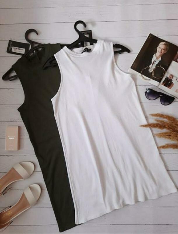 Трапецевидное сукню під горлечко, без рукавів, розширюється до низу. Колір білий - розмір 8, ПОГ - 43 див., ПОТ - 44 див., ПОБІДИ - 48 див, довжина - 79 див. Колір білий, розмір 14, ПОГ - 49, ПОТ - 50 див., ПОБІДИ - 54 див, довжина - 85 див. Колір хакі - розмір 10, ПОГ - 44 див., ПОТ - 46 див., ПОБІДИ - 49 див., довжина - 83 див.