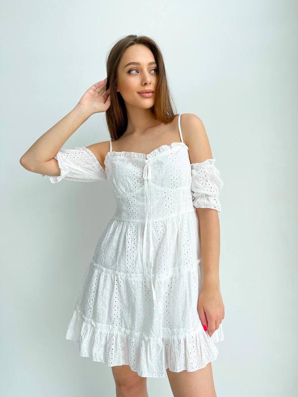 Платье из прошвы со съёмными рукавами🔝 Мод:640 Цвет: белый, голубой, желтый, сиреневый Размер: универсал 42-44 Ткань: прошва на хлопковой подкладке Длина 80см Цена 550 грн