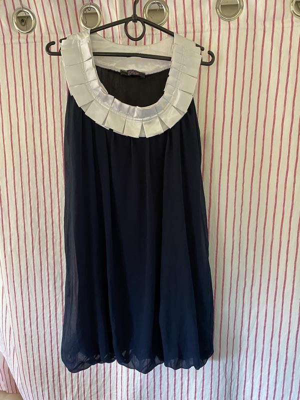 Темно синя з білим верхом. Шифонова сукня на підклаці Додаткові фото та заміри роблю при потребі. Є багато інших товарів у мене на сторінці