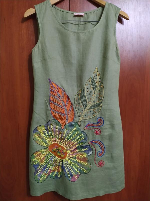Платье супер! Ткань лен, не жаркое. Очень хорошо садится по фигуре. Размер S. Красивый цвет и очень красиво смотрится вышивка. Сзади небольшая шлица, сбоку застёжка молния по шву.