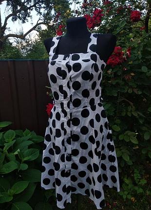 Дуже класне платтячко в горошок із тканини котон. Защіпається на гудзики і має лямки для поясочку (але його в комплекті немає ). Воно дуже стильне.